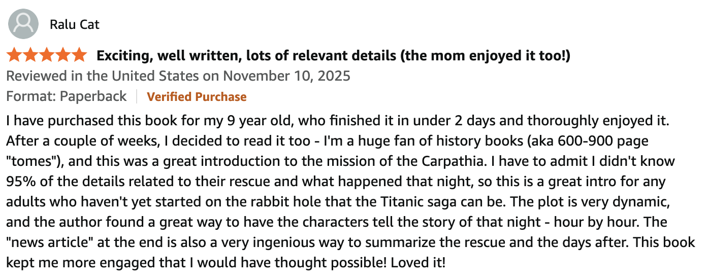 At 12:30 AM, fifteen-year-old Henry Cromwell heard something on his homemade radio that no one was supposed to hear. Now the Carpathia is running full speed into an ice field in the dead of night, no moon, no caution, every crew member wide awake. The Titanic is sinking. They think they can make it in time to rescue everyone... if the same ice that took Titanic doesn't take her rescuer.