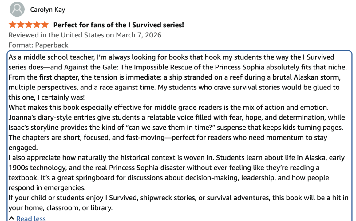 Finally, Against the Gale tells the story of the little-known but equally tragic "Titanic of the Pacific," the SS Princess Sopia, which he learned about while visiting Skagway, Alaska.